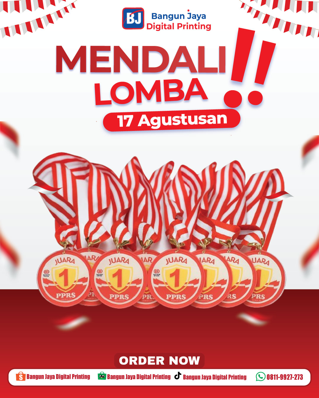 Desain promosi medali lomba HUT RI dari Bangun Jaya Digital Printing ini menampilkan deretan medali juara dengan warna merah putih yang khas, dilengkapi pita bergaris merah putih. Teks utama menonjolkan penawaran MEDALI LOMBA HUT RI untuk perayaan 17 Agustusan, lengkap dengan ajakan ORDER NOW dan informasi kontak di bagian bawah. Desain ini memadukan nuansa semangat kemerdekaan dengan elemen visual yang rapi dan menarik.